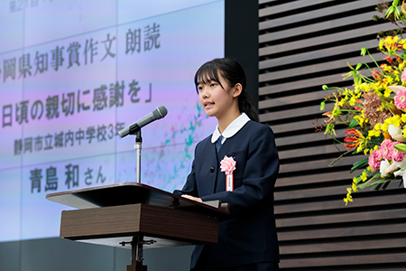 続いて、県本部から活動報告、あいさつ運動協力校への感謝状贈呈、作文コンクール入賞者への表彰状贈呈の後、あいさつ運動協力校による活動報告や県知事賞受賞者2名による作文の朗読が行われました。
